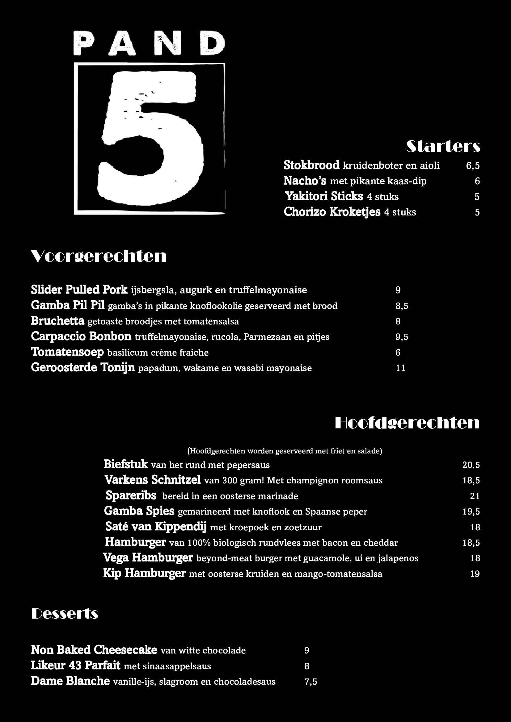 Voor grotere groepen kunnen wij ook een heerlijk menu op maat samenstellen. Dat kan natuurlijk ook een Walking Diner of een meer klassiek buffet zijn. Bereidt door onze keukenbrigade van Grand Cafe De Smidse en Pand 5 Food & Beer.